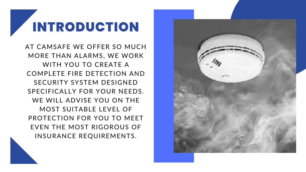 INTRODUCTION INTRODUCTION INTRODUCTION AT CAMSAFE WE OFFER SO MUCH MORE THAN ALARMS, WE WORK WITH YOU TO CREATE A COMPLETE FIRE DETECTION AND SECURITY SYSTEM DESIGNED SPECIFICALLY FOR YOUR NEEDS. WE WILL ADVISE YOU ON THE MOST SUITABLE LEVEL OF PROTECTION FOR YOU TO MEET EVEN THE MOST RIGOROUS OF INSURANCE REQUIREMENTS.