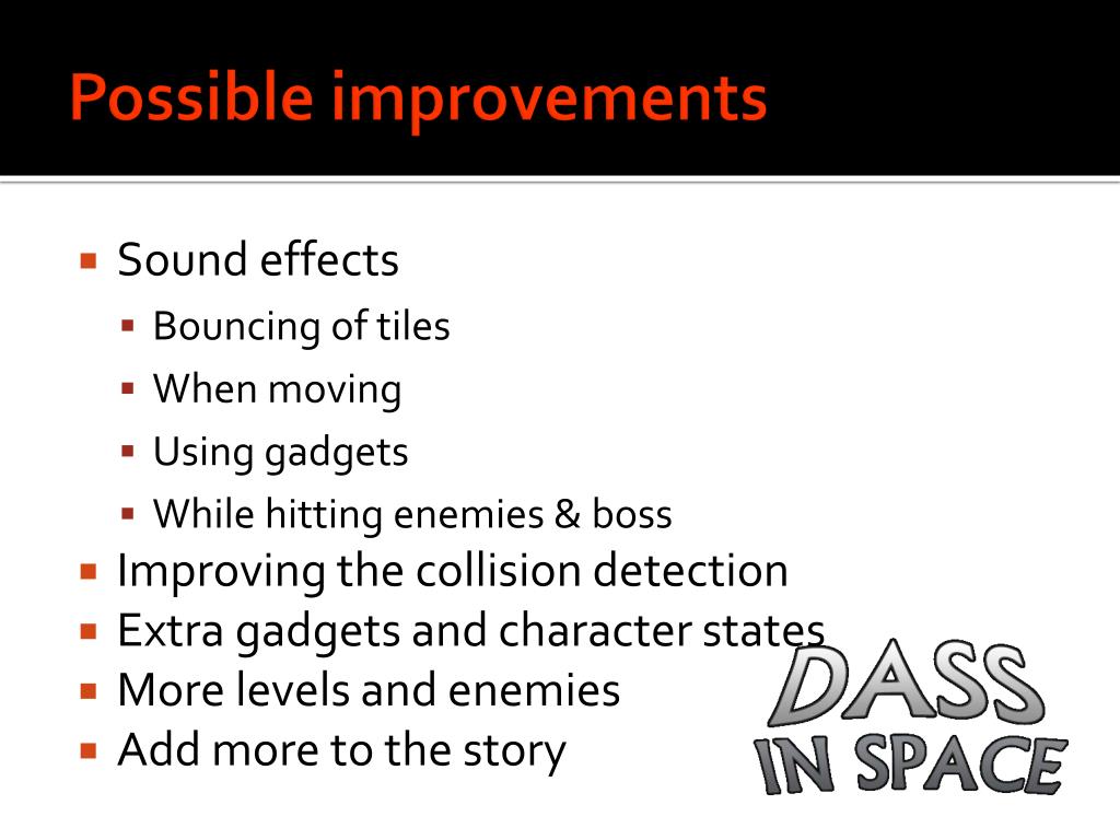 Possibleimprovements • Sound effects • Bouncing of tiles • Whenmoving • Using gadgets • Whilehittingenemies & boss • Improving the collisiondetection • Extra gadgets and characterstates • More levels and enemies • Add more to the story