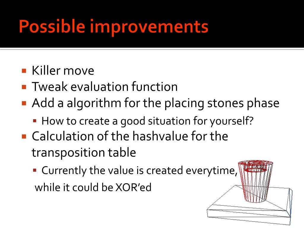 Possibleimprovements • Killer move • Tweakevaluationfunction • Add a algorithmfor the placingstonesphase • How to create a goodsituationforyourself? • Calculation of the hashvaluefor the transpositiontable • Currently the value is createdeverytime, whileitcouldbeXOR’ed