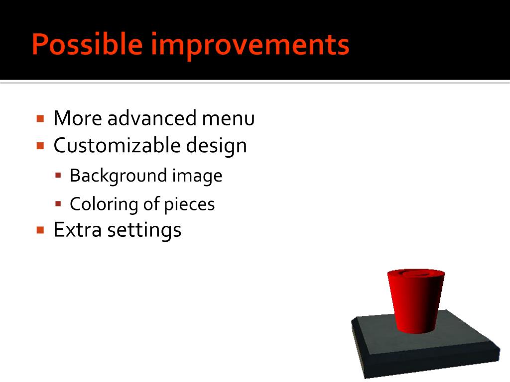 Possibleimprovements • More advanced menu • Customizable design • Background image • Coloring of pieces • Extra settings