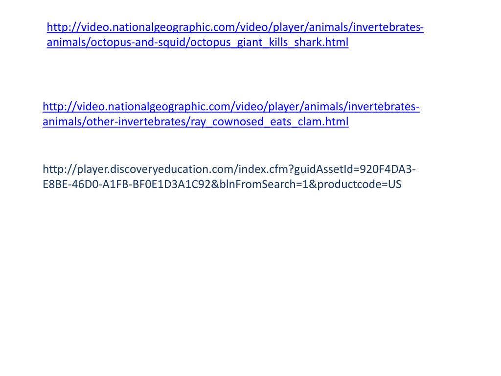 http://video.nationalgeographic.com/video/player/animals/invertebrates-animals/octopus-and-squid/octopus_giant_kills_shark.htmlhttp://video.nationalgeographic.com/video/player/animals/invertebrates-animals/octopus-and-squid/octopus_giant_kills_shark.html http://video.nationalgeographic.com/video/player/animals/invertebrates-animals/other-invertebrates/ray_cownosed_eats_clam.html http://player.discoveryeducation.com/index.cfm?guidAssetId=920F4DA3-E8BE-46D0-A1FB-BF0E1D3A1C92&blnFromSearch=1&productcode=US