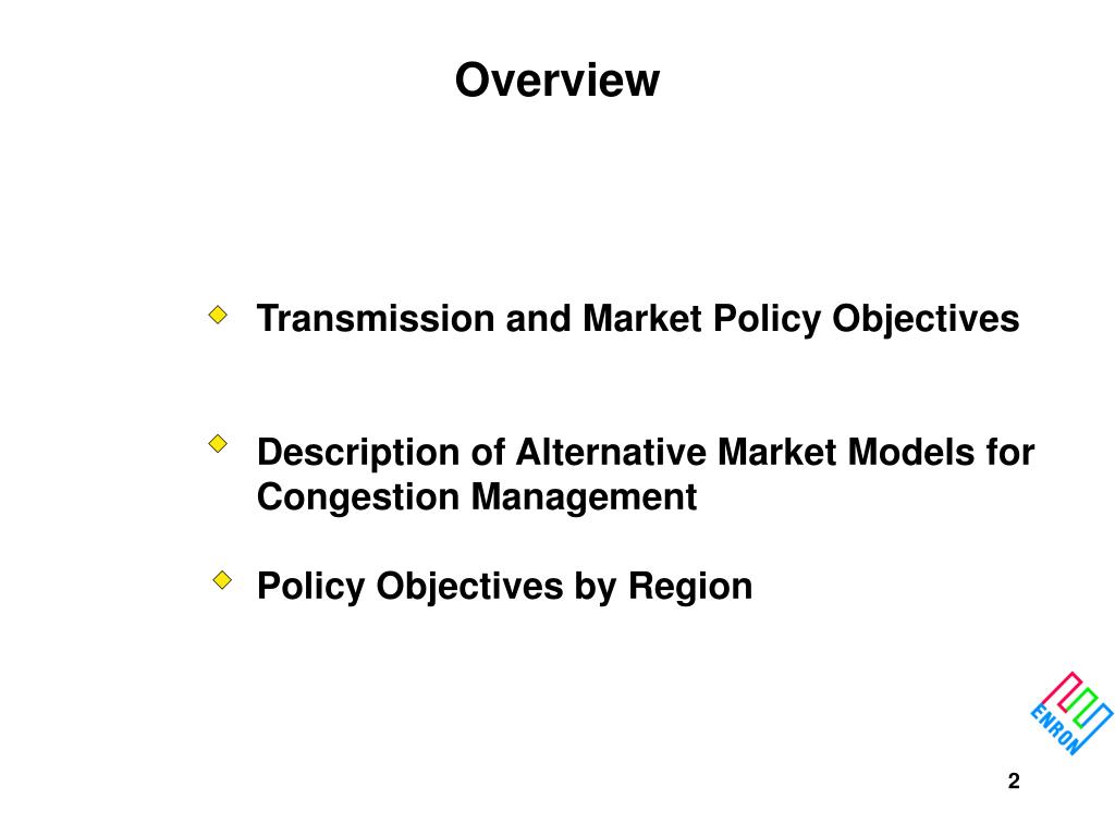 Overview Transmission and Market Policy Objectives Description of Alternative Market Models for Congestion Management Policy Objectives by Region