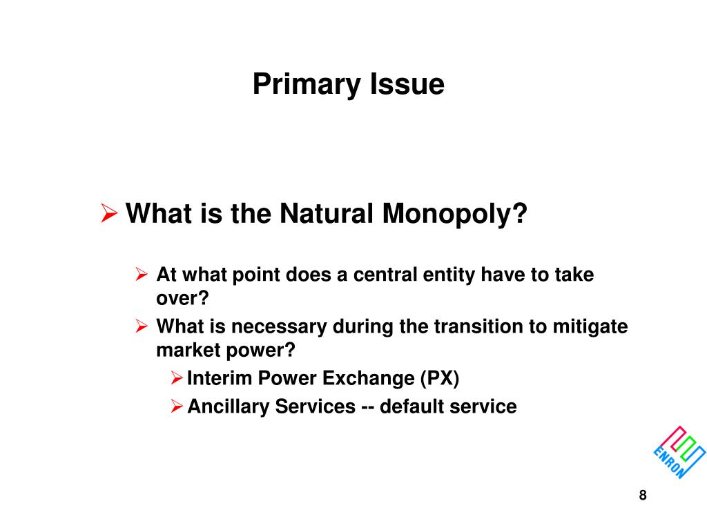 Primary Issue • What is the Natural Monopoly? • At what point does a central entity have to take over? • What is necessary during the transition to mitigate market power? • Interim Power Exchange (PX) • Ancillary Services -- default service