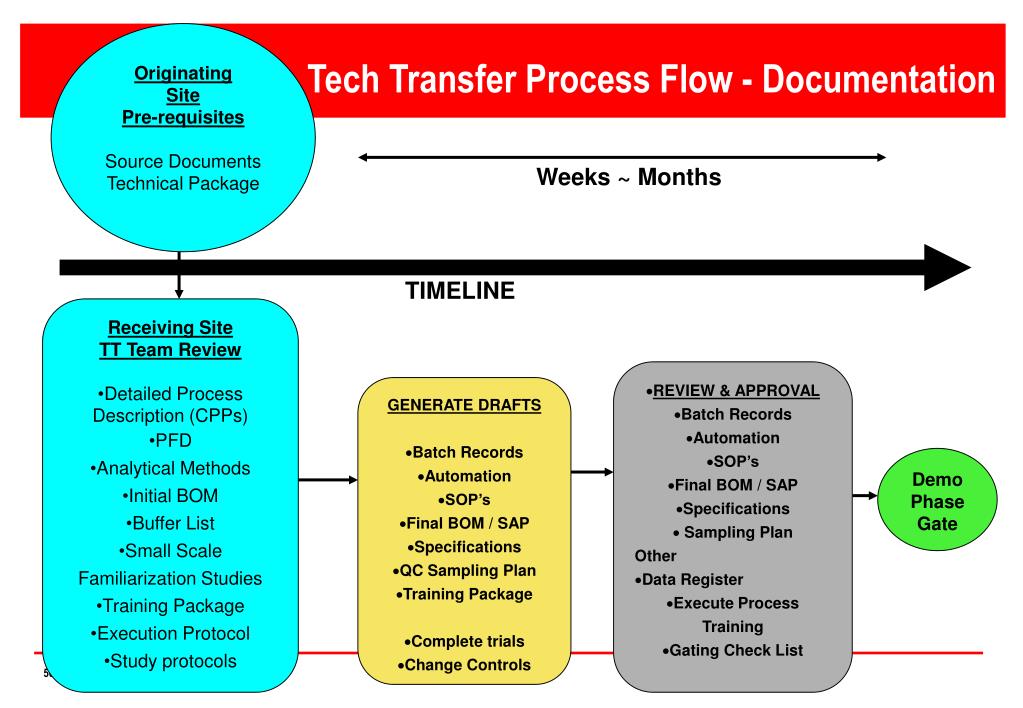 Tech Transfer Process Flow - Documentation Originating Site Pre-requisites Source Documents Technical Package Weeks ~ Months TIMELINE Receiving Site TT Team Review • Detailed Process Description (CPPs) • PFD • Analytical Methods • Initial BOM • Buffer List • Small Scale Familiarization Studies • Training Package • Execution Protocol • Study protocols • REVIEW & APPROVAL • Batch Records • Automation • SOP’s • Final BOM / SAP • Specifications • Sampling Plan Other • Data Register • Execute Process Training • Gating Check List GENERATE DRAFTS • Batch Records • Automation • SOP’s • Final BOM / SAP • Specifications • QC Sampling Plan • Training Package • Complete trials • Change Controls Demo Phase Gate