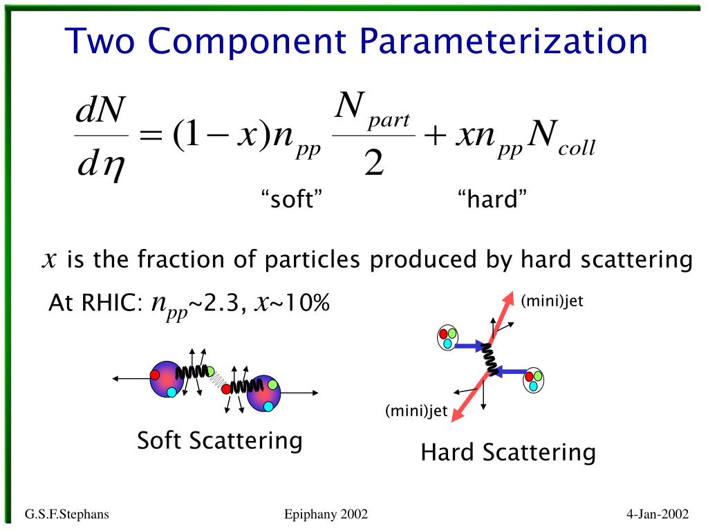(mini)jet (mini)jet Soft Scattering Two Component Parameterization “soft” “hard” xis the fraction of particles produced by hard scattering At RHIC:npp~2.3, x~10% Hard Scattering G.S.F.Stephans Epiphany 2002