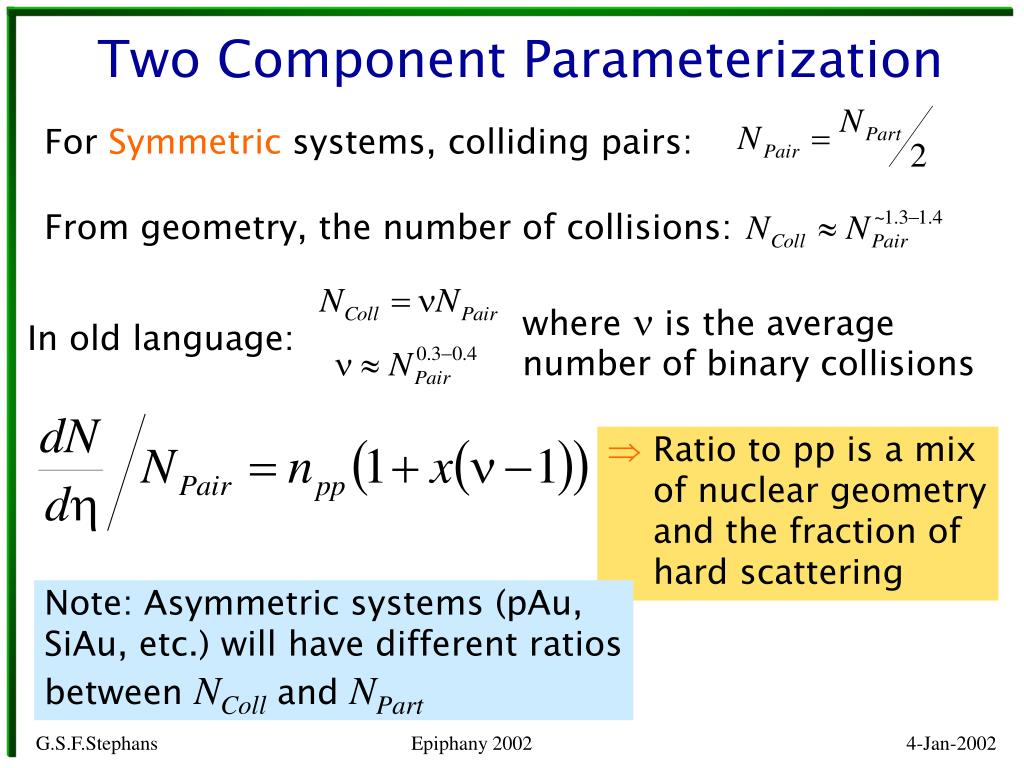Two Component Parameterization For Symmetric systems, colliding pairs: From geometry, the number of collisions: where n is the average number of binary collisions In old language: • Ratio to pp is a mix of nuclear geometry and the fraction of hard scattering Note: Asymmetric systems (pAu, SiAu, etc.) will have different ratios between NColl and NPart G.S.F.Stephans Epiphany 2002