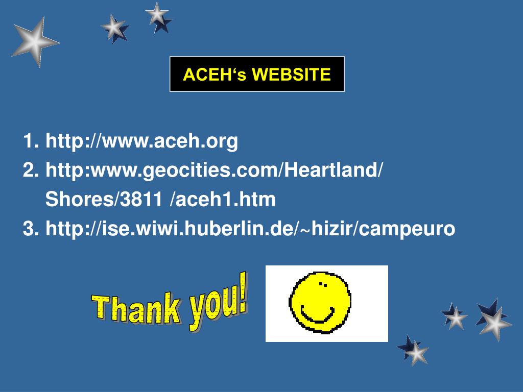 ACEH‘s WEBSITE 1. http://www.aceh.org 2. http:www.geocities.com/Heartland/ Shores/3811 /aceh1.htm 3. http://ise.wiwi.huberlin.de/~hizir/campeuro Thank you!