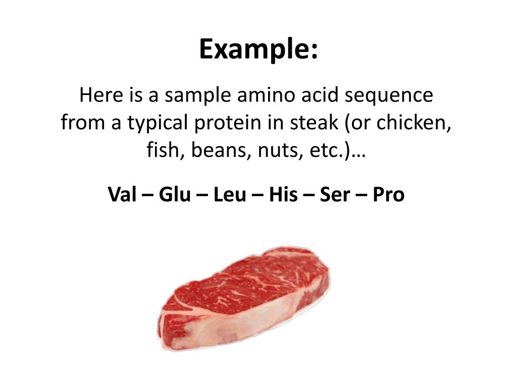 Example: Here is a sample amino acid sequence from a typical protein in steak (or chicken, fish, beans, nuts, etc.)… Val – Glu – Leu – His – Ser – Pro