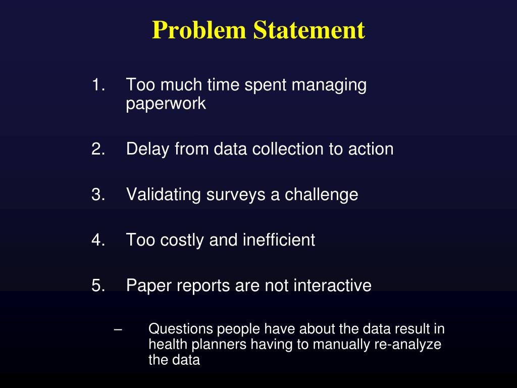 Problem Statement • Too much time spent managing paperwork • Delay from data collection to action • Validating surveys a challenge • Too costly and inefficient • Paper reports are not interactive • Questions people have about the data result in health planners having to manually re-analyze the data