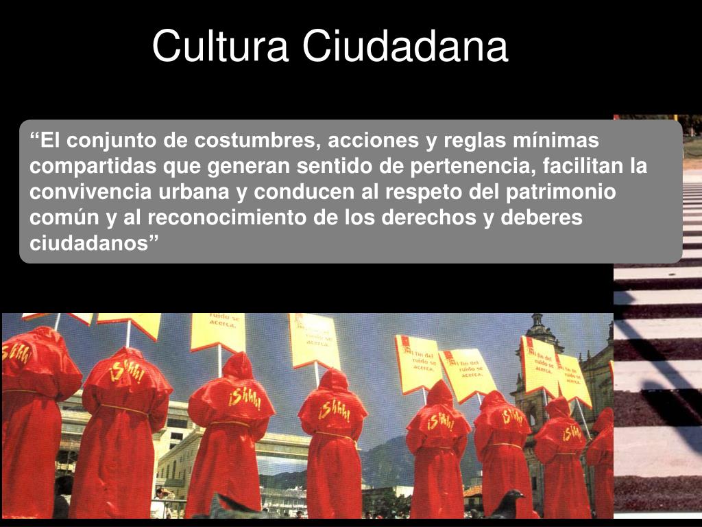 Cultura Ciudadana “El conjunto de costumbres, acciones y reglas mínimas compartidas que generan sentido de pertenencia, facilitan la convivencia urbana y conducen al respeto del patrimonio común y al reconocimiento de los derechos y deberes ciudadanos” Regulación cultural de las interacciones entre desconocidos y entre desconocidos y funcionarios. Mínimo de reglas compartidas para aprovechar y gozar la pluralidad cultural y moral.