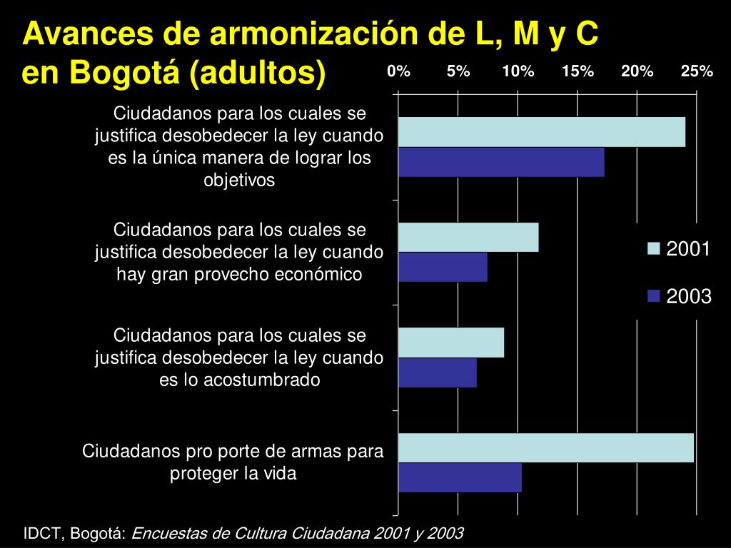 Avances de armonización de L, M y C en Bogotá (adultos) IDCT, Bogotá: Encuestas de Cultura Ciudadana 2001 y 2003