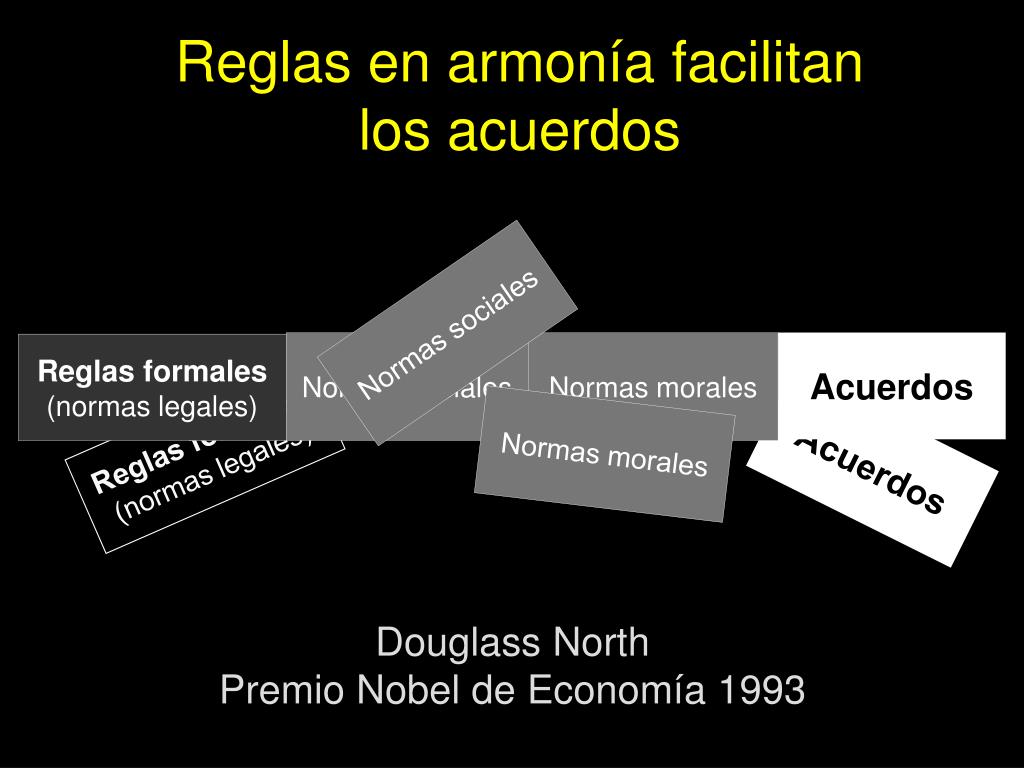 Marco conceptualMecanismos de regulación Reglas en armonía facilitan los acuerdos Reglas formales(normas legales) Normas sociales Normas sociales Normas morales Acuerdos Reglas formales(normas legales) Normas morales Acuerdos Douglass North Premio Nobel de Economía 1993