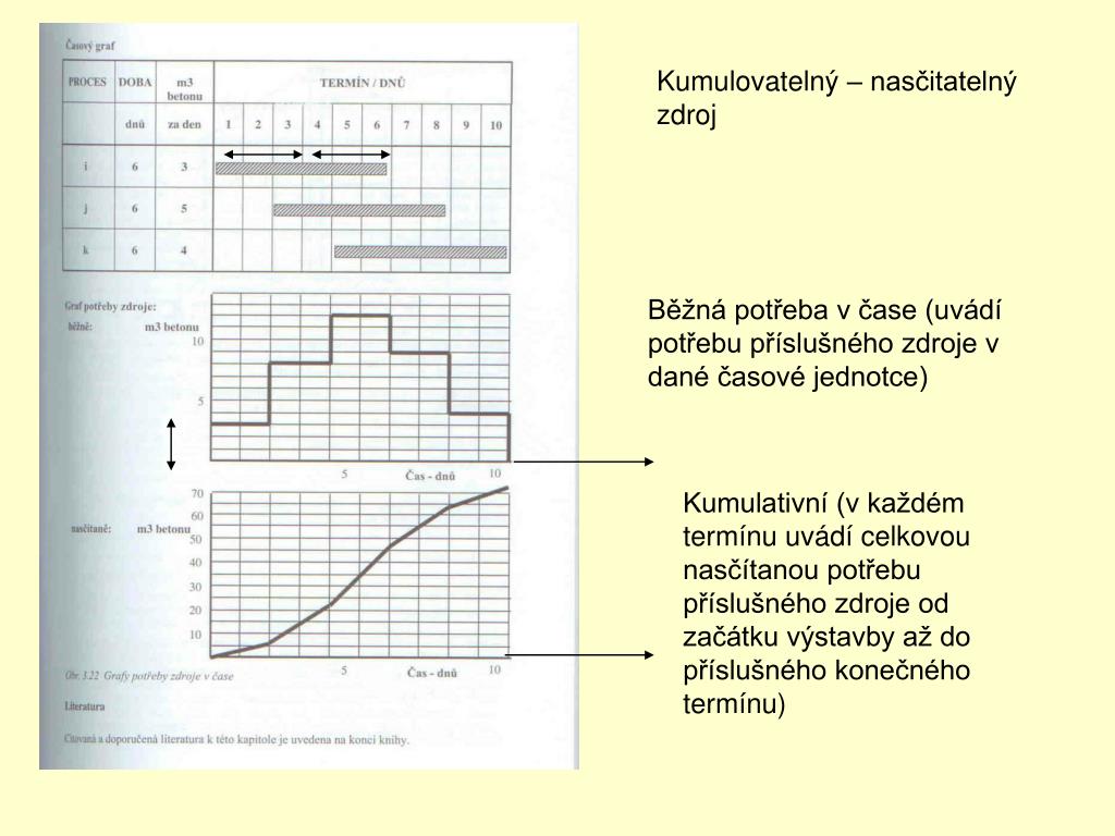 Kumulovatelný – nasčitatelný zdroj Běžná potřeba v čase (uvádí potřebu příslušného zdroje v dané časové jednotce) Kumulativní (v každém termínu uvádí celkovou nasčítanou potřebu příslušného zdroje od začátku výstavby až do příslušného konečného termínu)