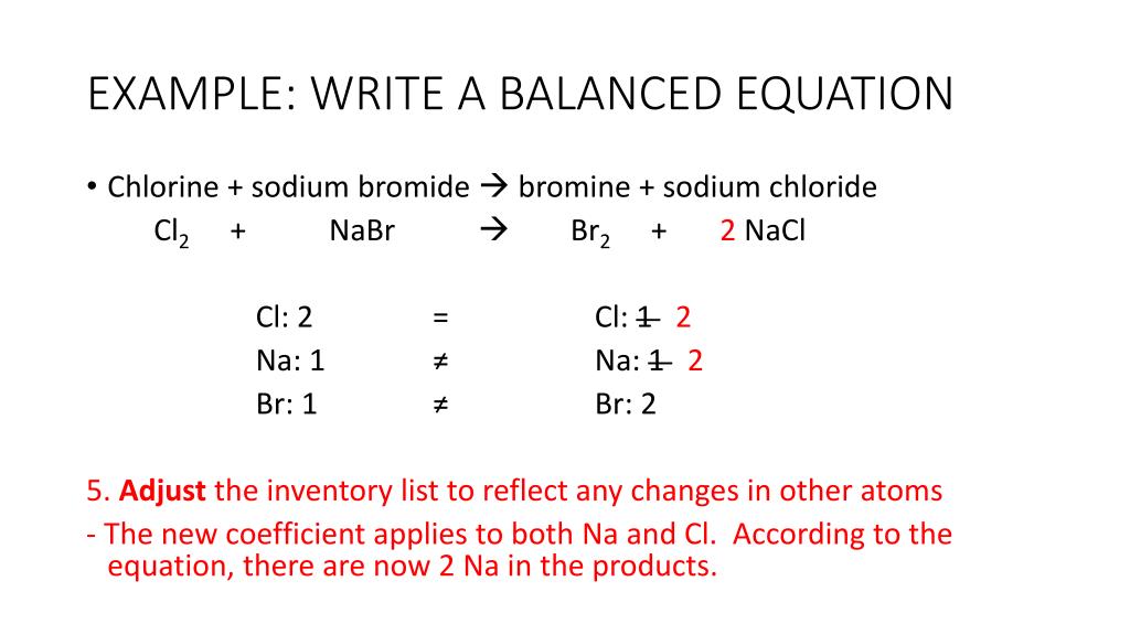 EXAMPLE: WRITE A BALANCED EQUATION • Chlorine + sodium bromide bromine + sodium chloride Cl2 + NaBr Br2 + 2NaCl Cl: 2 = Cl: 1 2 Na: 1 ≠ Na: 1 2 Br: 1 ≠ Br: 2 5. Adjust the inventory list to reflect any changes in other atoms - The new coefficient applies to both Na and Cl. According to the equation, there are now 2 Na in the products.
