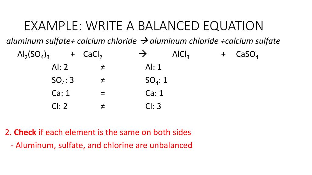 EXAMPLE: WRITE A BALANCED EQUATION aluminum sulfate+ calcium chloride aluminum chloride +calcium sulfate Al2(SO4)3 + CaCl2 2AlCl3 + CaSO4 Al: 2 = Al: 12 SO4: 3 ≠ SO4: 1 Ca: 1 = Ca: 1 Cl: 2 ≠ Cl: 36 5. Adjust the inventory list to reflect any changes in other atoms - The new coefficient applies to both Al and Cl. According to the equation, there are now 6 Cl in the products (2 from coefficient x 3 from subscript).