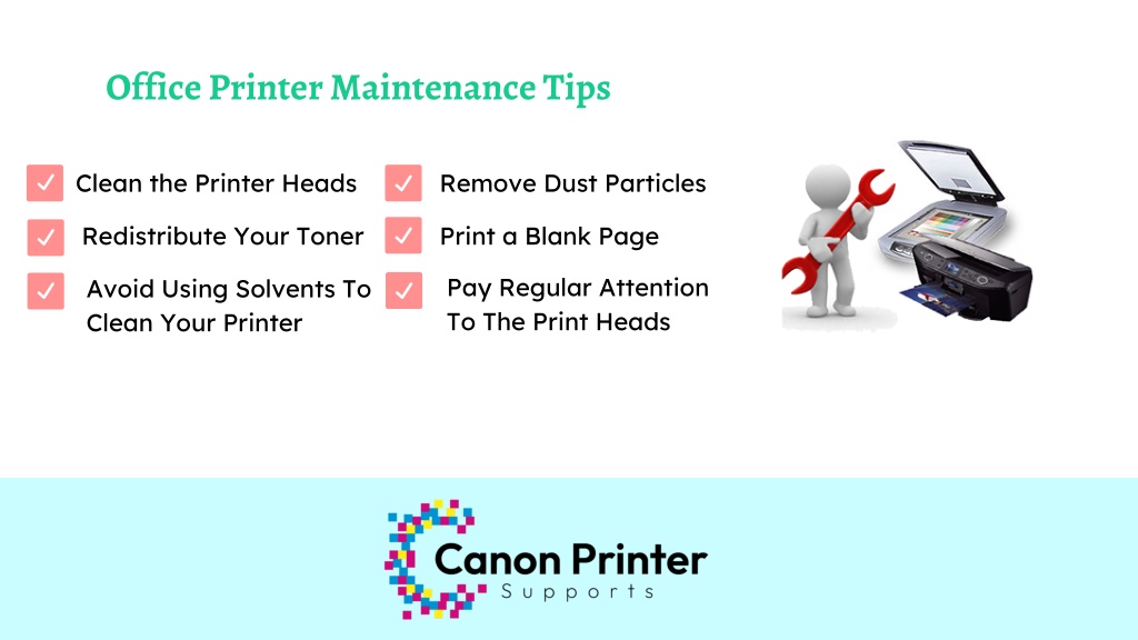 Office Printer Maintenance Tips Clean the Printer Heads Remove Dust Particles Redistribute Your Toner Print a Blank Page Pay Regular Attention To The Print Heads Avoid Using Solvents To Clean Your Printer