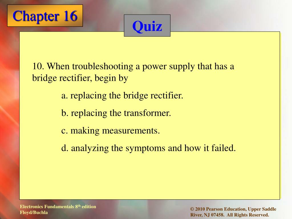 Quiz 10. When troubleshooting a power supply that has a bridge rectifier, begin by a. replacing the bridge rectifier. b. replacing the transformer. c. making measurements. d. analyzing the symptoms and how it failed.