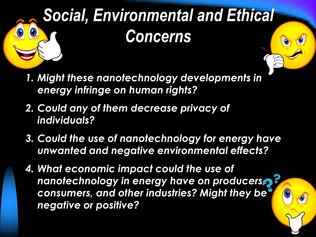 Social, Environmental and Ethical Concerns • Might these nanotechnology developments in energy infringe on human rights? • Could any of them decrease privacy of individuals? • Could the use of nanotechnology for energy have unwanted and negative environmental effects? • What economic impact could the use of nanotechnology in energy have on producers, consumers, and other industries? Might they be negative or positive?