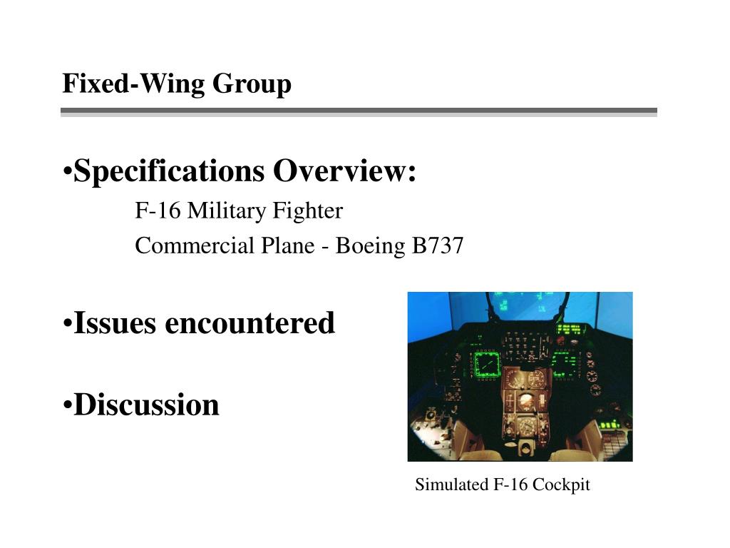 Fixed-Wing Group Specifications Overview: F-16 Military Fighter Commercial Plane - Boeing B737 Issues encountered Discussion Simulated F-16 Cockpit