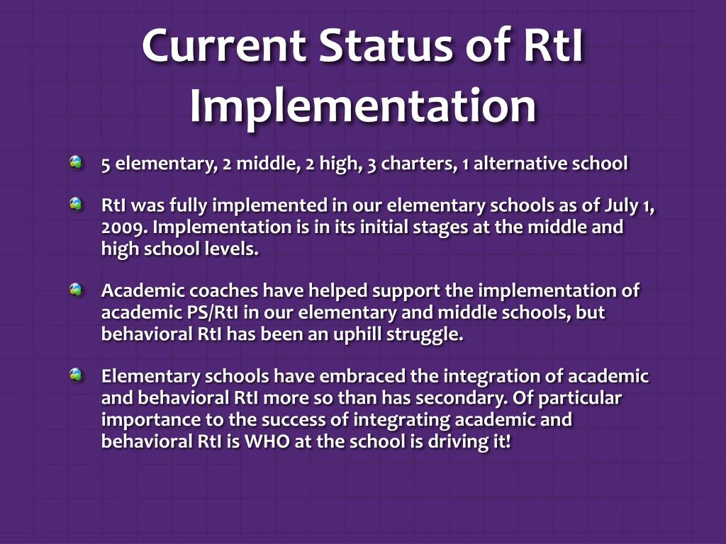 Current Status of RtI Implementation • 5 elementary, 2 middle, 2 high, 3 charters, 1 alternative school • RtI was fully implemented in our elementary schools as of July 1, 2009. Implementation is in its initial stages at the middle and high school levels. • Academic coaches have helped support the implementation of academic PS/RtI in our elementary and middle schools, but behavioral RtI has been an uphill struggle. • Elementary schools have embraced the integration of academic and behavioral RtI more so than has secondary. Of particular importance to the success of integrating academic and behavioral RtI is WHO at the school is driving it!