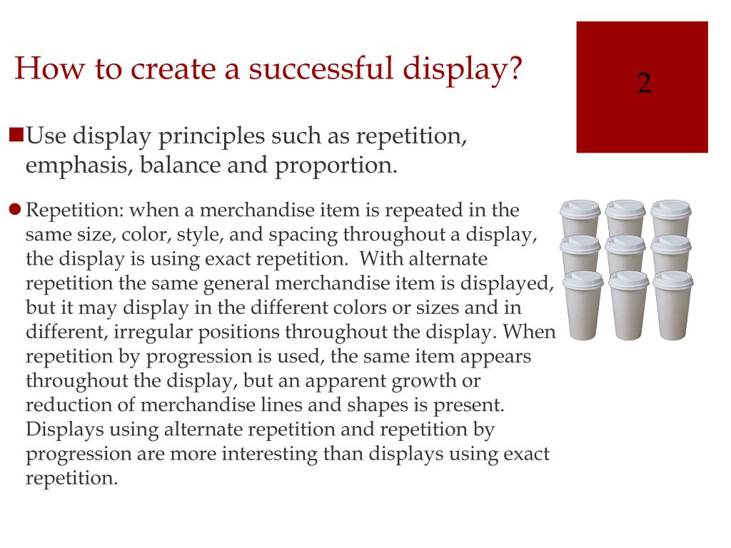 2 How to create a successful display? • Use display principles such as repetition, emphasis, balance and proportion. • Repetition: when a merchandise item is repeated in the same size, color, style, and spacing throughout a display, the display is using exact repetition. With alternate repetition the same general merchandise item is displayed, but it may display in the different colors or sizes and in different, irregular positions throughout the display. When repetition by progression is used, the same item appears throughout the display, but an apparent growth or reduction of merchandise lines and shapes is present. Displays using alternate repetition and repetition by progression are more interesting than displays using exact repetition.