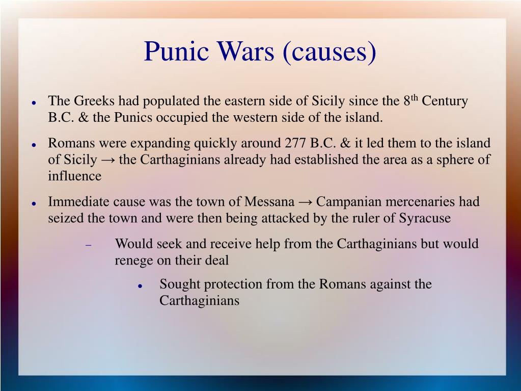 Punic Wars (causes) The Greeks had populated the eastern side of Sicily since the 8th Century B.C. & the Punics occupied the western side of the island. Romans were expanding quickly around 277 B.C. & it led them to the island of Sicily → the Carthaginians already had established the area as a sphere of influence Immediate cause was the town of Messana → Campanian mercenaries had seized the town and were then being attacked by the ruler of Syracuse Would seek and receive help from the Carthaginians but would renege on their deal Sought protection from the Romans against the Carthaginians