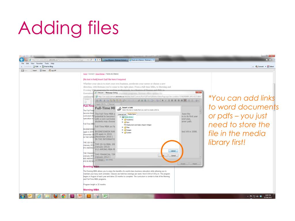 Adding files *You can add links to word documents or pdfs – you just need to store the file in the media library first!
