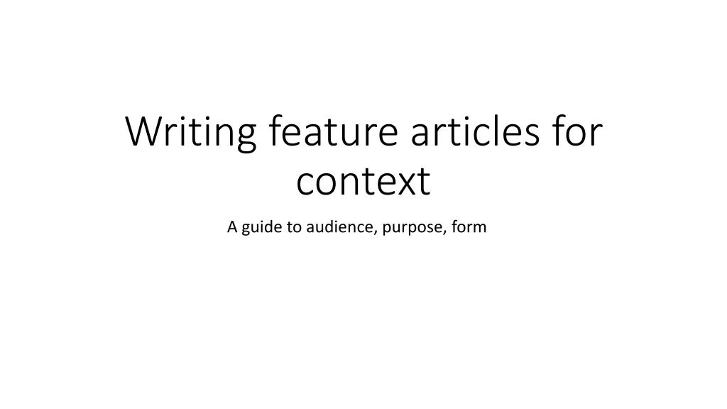 Writing feature articles for context. A guide to audience, purpose, form . What is a feature article?. There are many types of feature articles. They are not the same as news articles, which are based on an event and aim to explain what happened. . Examples of features. How to guides Humour