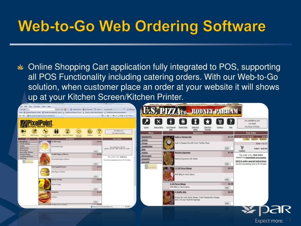 Web-to-Go Web Ordering Software • Online Shopping Cart application fully integrated to POS, supporting all POS Functionality including catering orders. With our Web-to-Go solution, when customer place an order at your website it will shows up at your Kitchen Screen/Kitchen Printer.
