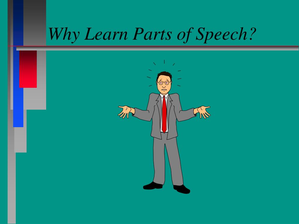 Why Learn Parts of Speech? • They are the building blocks of English grammar. • Understanding and applying a process is learning to learn. • It is a foundation to improve your writing.