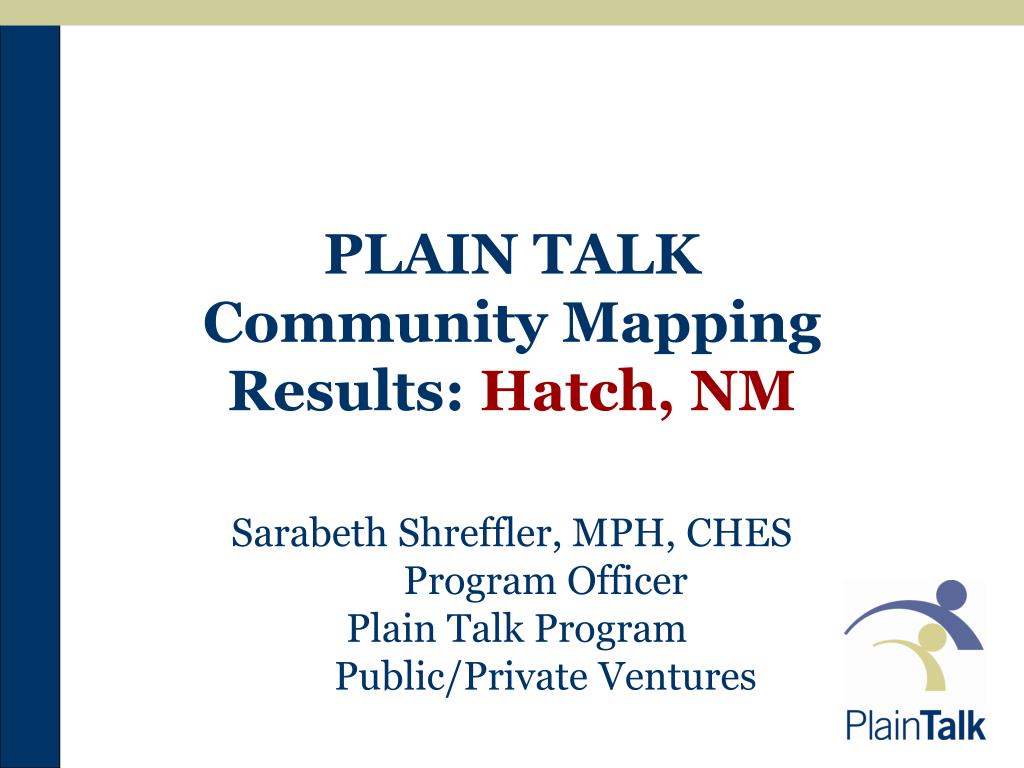 PLAIN TALK Community Mapping Results: Hatch, NM Sarabeth Shreffler, MPH, CHES Program Officer Plain Talk Program Public/Private Ventures