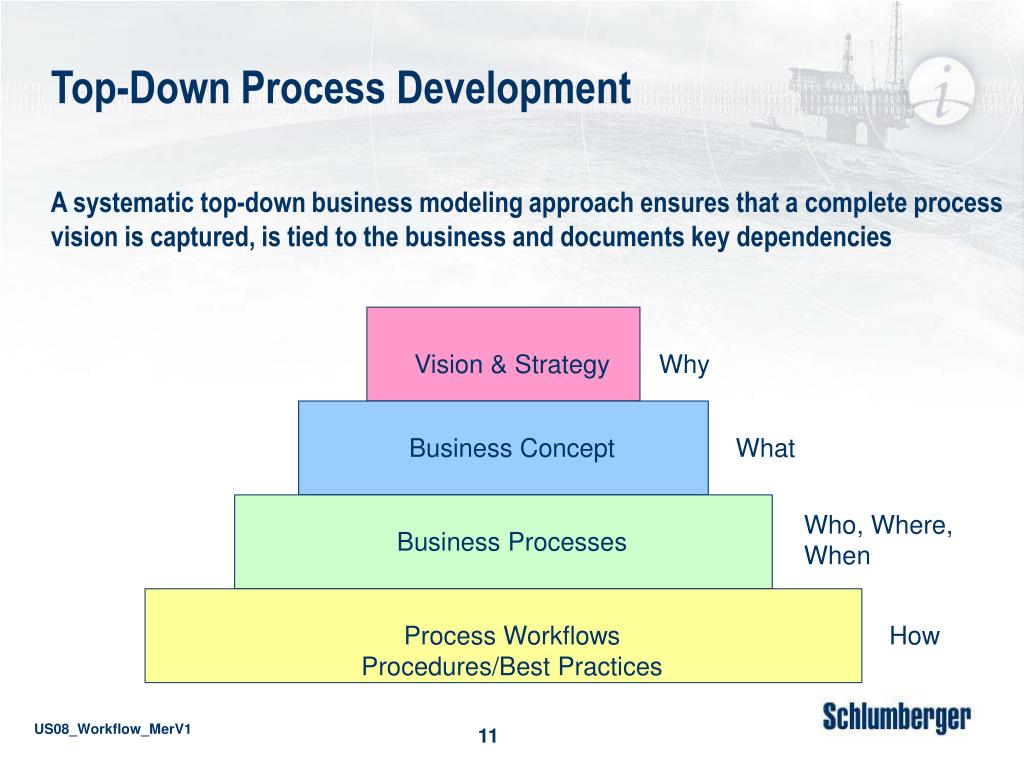 Top-Down Process Development • A systematic top-down business modeling approach ensures that a complete process vision is captured, is tied to the business and documents key dependencies Vision & Strategy Why Business Concept What Who, Where, When Business Processes Process Workflows Procedures/Best Practices How