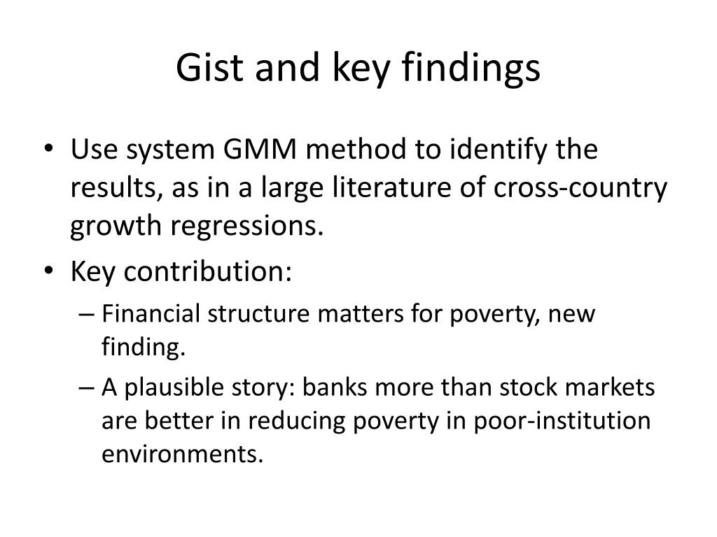 Gist and key findings • Use system GMM method to identify the results, as in a large literature of cross-country growth regressions. • Key contribution: • Financial structure matters for poverty, new finding. • A plausible story: banks more than stock markets are better in reducing poverty in poor-institution environments.