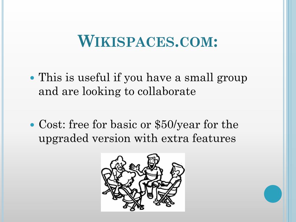 Wikispaces.com: • This is useful if you have a small group and are looking to collaborate • Cost: free for basic or $50/year for the upgraded version with extra features