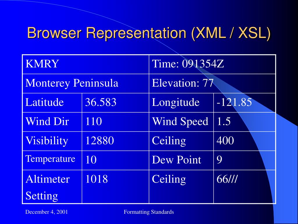 XML ExampleWeather Observation Markup Format (OMF) METAR KMRY 091345 11003KT 8SM BKN004 10/09 A3006 ^M^M RMK A02CIG 003V008 SLP193 T01000094=^M^M <SYN Title=‘Metar’ TStamp=‘950104440’ LatLon= ’36.583, -121.85’ BId=‘724915’ Sname=‘Monterey Peninsula’ Elev=’77’> <SYID>KMRY 091345Z</SYID> <SYCODE>RMK A02 CIG 003V008 SLP193 T01000094</SYCODE> <SYG Wind=‘110, 1.5’ Vis=‘12880’ Ceiling=‘400’ T=’10’ TD=‘9’ AS=‘1018’ Clouds=’66///’> 11003KT 8SM BKN004 10/09 A306</SYG> </SYN> http://zowie.metnet.navy.mil/~spawar/JMV-TNG/XML/OMF-SYNOP.html Formatting Standards