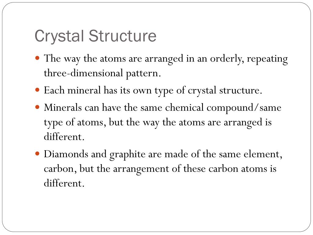 Crystal Structure • The way the atoms are arranged in an orderly, repeating three-dimensional pattern. • Each mineral has its own type of crystal structure. • Minerals can have the same chemical compound/same type of atoms, but the way the atoms are arranged is different. • Diamonds and graphite are made of the same element, carbon, but the arrangement of these carbon atoms is different.