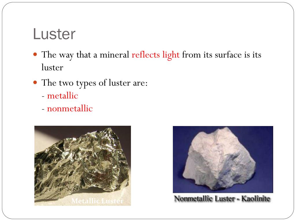 Luster • The way that a mineral reflects light from its surface is its luster • The two types of luster are:- metallic- nonmetallic Metallic Luster