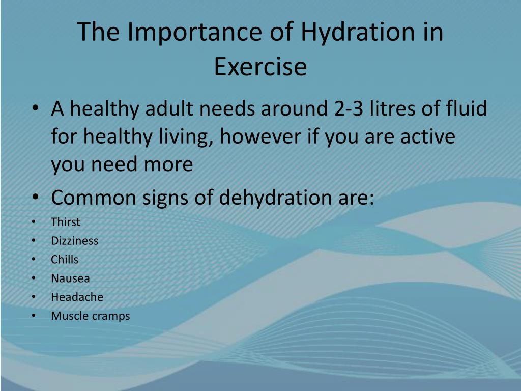 The Importance of Hydration in Exercise • A healthy adult needs around 2-3 litres of fluid for healthy living, however if you are active you need more • Common signs of dehydration are: • Thirst • Dizziness • Chills • Nausea • Headache • Muscle cramps