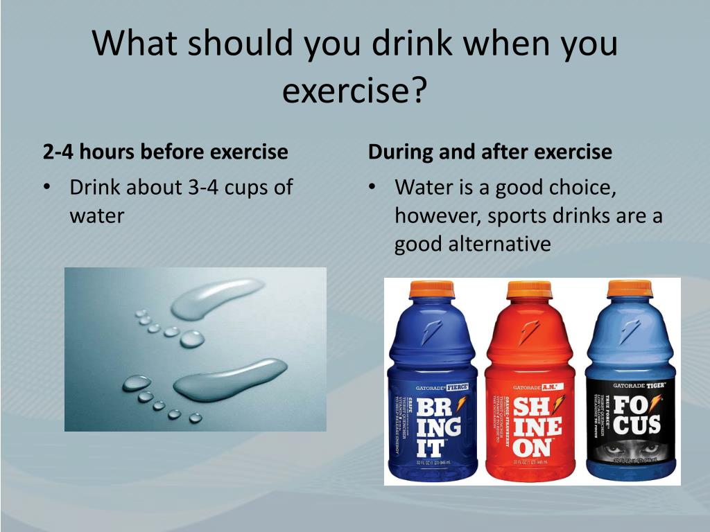 What should you drink when you exercise? 2-4 hours before exercise During and after exercise Water is a good choice, however, sports drinks are a good alternative • Drink about 3-4 cups of water
