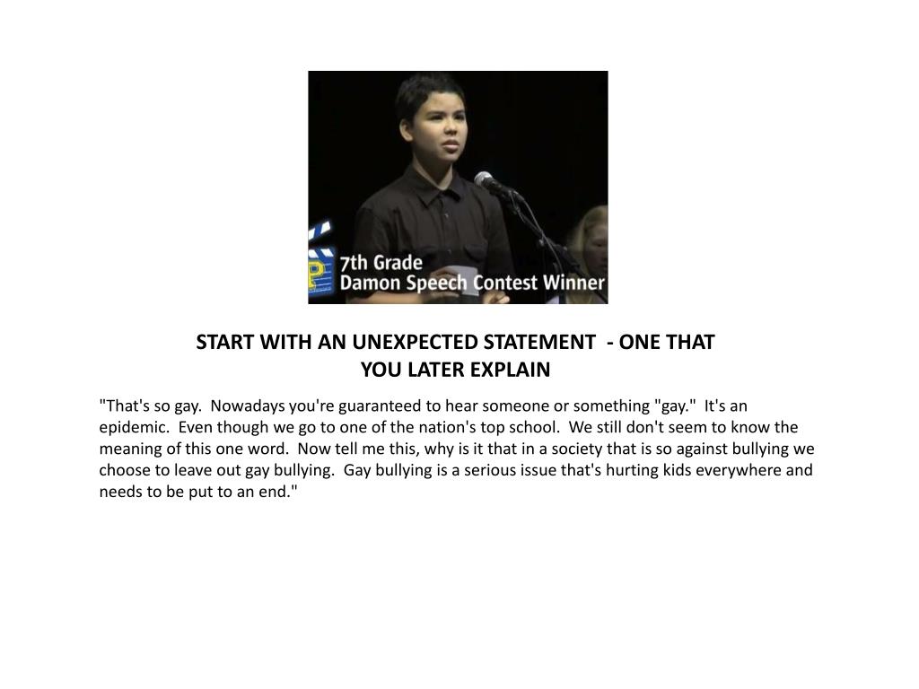START WITH AN UNEXPECTED STATEMENT - ONE THAT YOU LATER EXPLAIN "That's so gay. Nowadays you're guaranteed to hear someone or something "gay." It's an epidemic. Even though we go to one of the nation's top school. We still don't seem to know the meaning of this one word. Now tell me this, why is it that in a society that is so against bullying we choose to leave out gay bullying. Gay bullying is a serious issue that's hurting kids everywhere and needs to be put to an end."