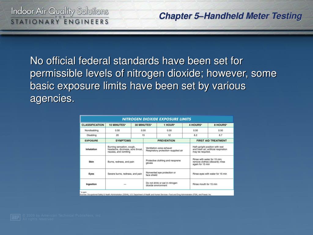 No official federal standards have been set for permissible levels of nitrogen dioxide; however, some basic exposure limits have been set by various agencies.