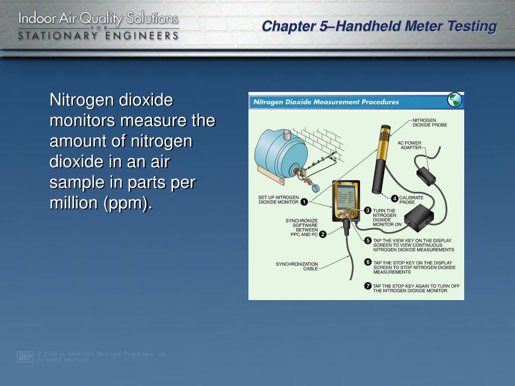 Nitrogen dioxide monitors measure the amount of nitrogen dioxide in an air sample in parts per million (ppm).