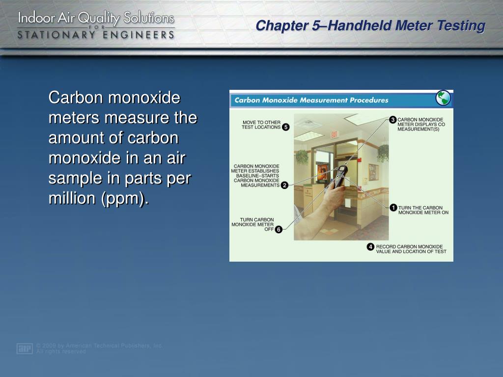 Carbon monoxide meters measure the amount of carbon monoxide in an air sample in parts per million (ppm).
