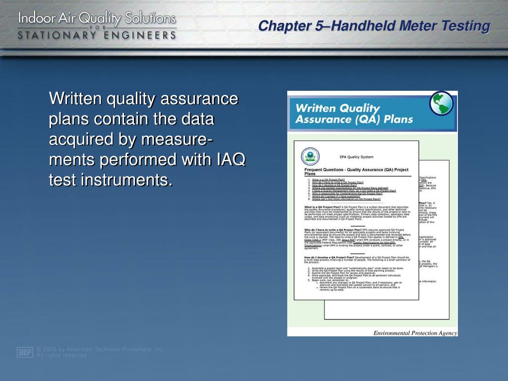 Written quality assurance plans contain the data acquired by measure-ments performed with IAQ test instruments.