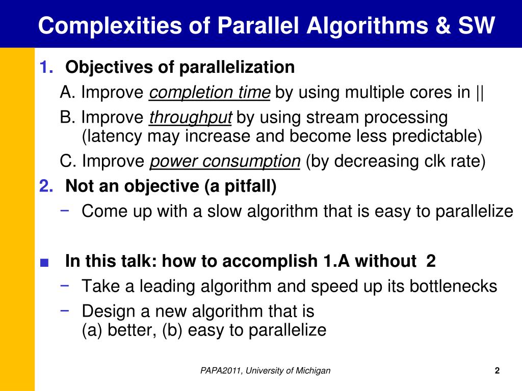 Complexities of Parallel Algorithms & SW Objectives of parallelization A. Improve completion time by using multiple cores in || B. Improve throughput by using stream processing(latency may increase and become less predictable) C. Improve power consumption (by decreasing clk rate) Not an objective (a pitfall) Come up with a slow algorithm that is easy to parallelize In this talk: how to accomplish 1.A without 2 Take a leading algorithm and speed up its bottlenecks Design a new algorithm that is(a) better, (b) easy to parallelize PAPA2011, University of Michigan