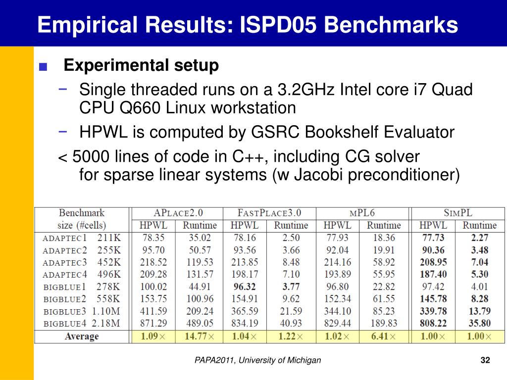 Empirical Results: ISPD05 Benchmarks Experimental setup Single threaded runs on a 3.2GHz Intel core i7 Quad CPU Q660 Linux workstation HPWL is computed by GSRC Bookshelf Evaluator < 5000 lines of code in C++, including CG solverfor sparse linear systems (w Jacobi preconditioner) PAPA2011, University of Michigan