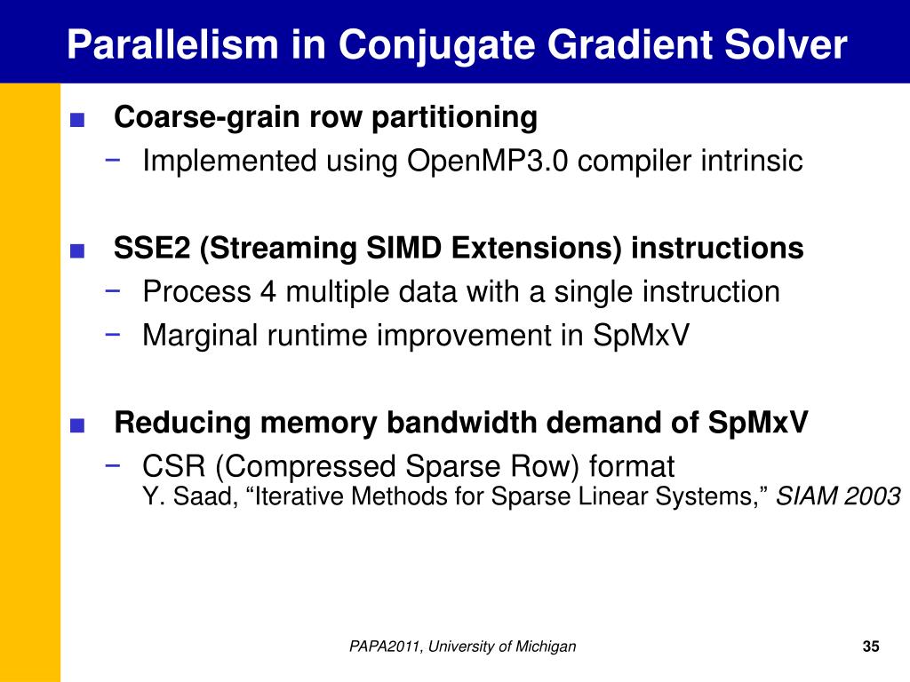 Parallelism in Conjugate Gradient Solver Coarse-grain row partitioning Implemented using OpenMP3.0 compiler intrinsic SSE2 (Streaming SIMD Extensions) instructions Process 4 multiple data with a single instruction Marginal runtime improvement in SpMxV Reducing memory bandwidth demand of SpMxV CSR (Compressed Sparse Row) format Y. Saad, “Iterative Methods for Sparse Linear Systems,” SIAM 2003 PAPA2011, University of Michigan