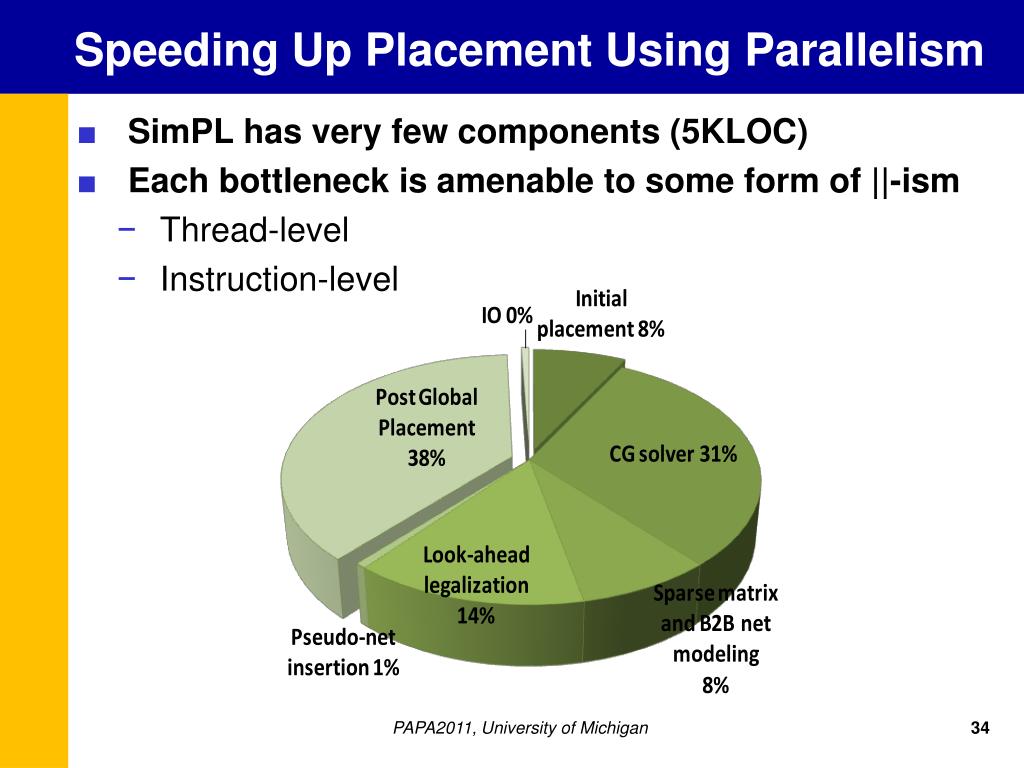 Speeding Up Placement Using Parallelism SimPL has very few components (5KLOC) Each bottleneck is amenable to some form of ||-ism Thread-level Instruction-level PAPA2011, University of Michigan