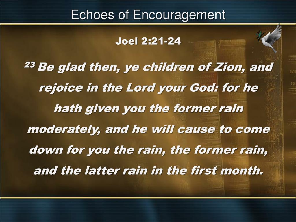 Echoes of Encouragement Joel 2:21-24 23 Be glad then, ye children of Zion, and rejoice in the Lord your God: for he hath given you the former rain moderately, and he will cause to come down for you the rain, the former rain, and the latter rain in the first month.