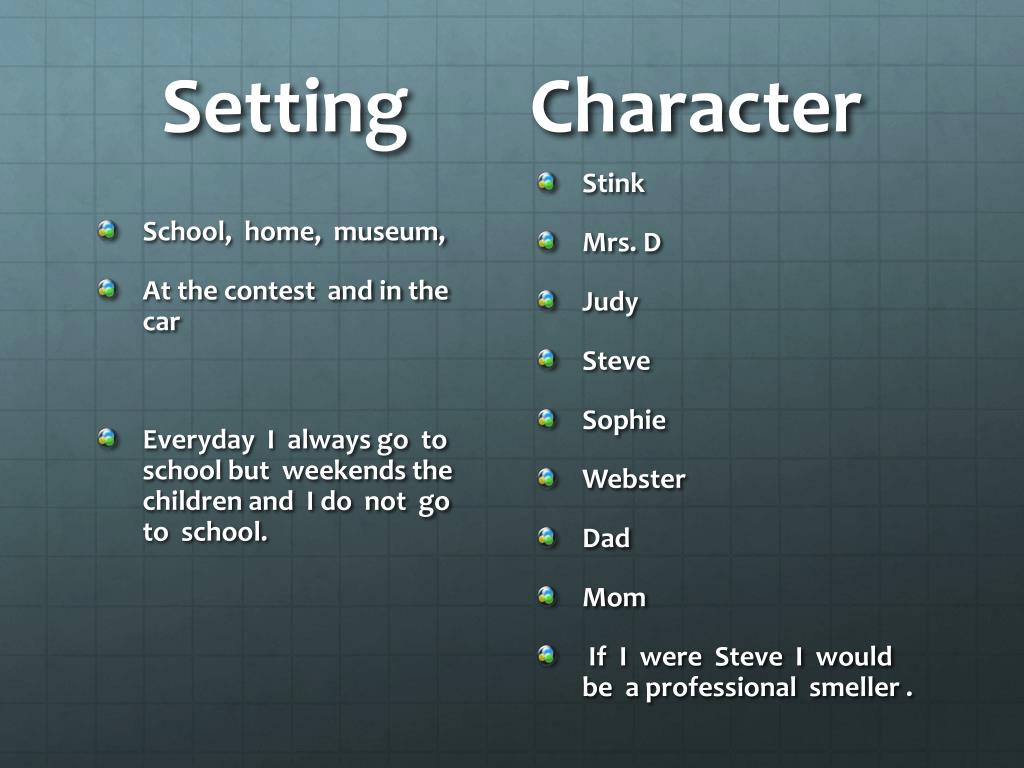 Setting Character • School, home, museum, • At the contest and in the car • Everyday I always go to school but weekends the children and I do not go to school. • Stink • Mrs. D • Judy • Steve • Sophie • Webster • Dad • Mom • If I were Steve I would be a professional smeller .